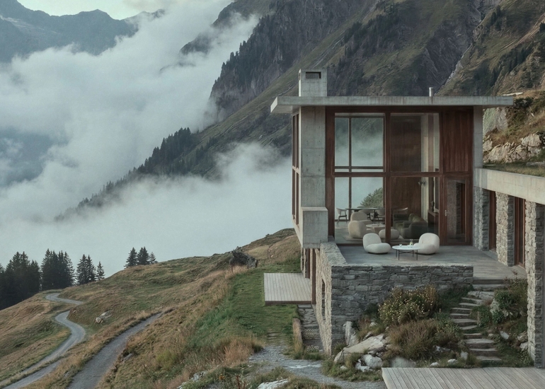 In his earliest sketches, Pierre Paulin imagined sitting as a sensation, expressed through rounded forms that seem to float and hold the body with ease. From this idea came a new way of sitting: low, generous, and free from convention. Set within an alpine dreamscape, clouds circle gently, echoing the curves of Pacha.