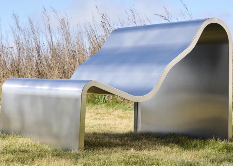 Ławka Dream View zachęca do relaksu i marzeń. Jej płynne krzywizny dopasowują się do naturalnych kształtów ciała, delikatnie kierując uwagę ku niebu. Dostępna w dwóch rozmiarach, zapewnia przestrzeń do spokojnej introspekcji lub wspólnej refleksji. Wykonana w Danii, jej powierzchnia ze szczotkowanej stali nierdzewnej odbija zmieniające się otoczenie, potęgując poczucie otwartości. Nadaje się zarówno do użytku wewnątrz, jak i na zewnątrz, z opcją montażu na podłodze.