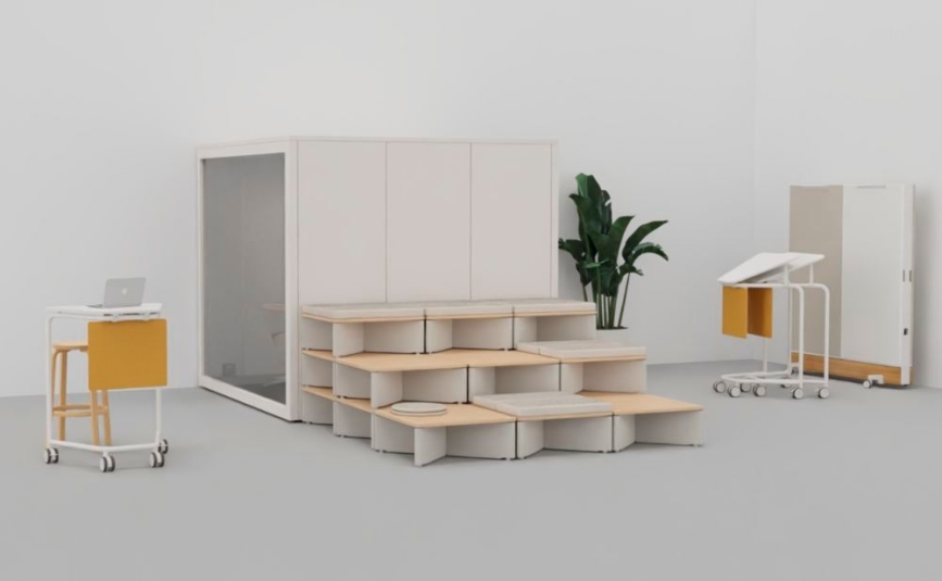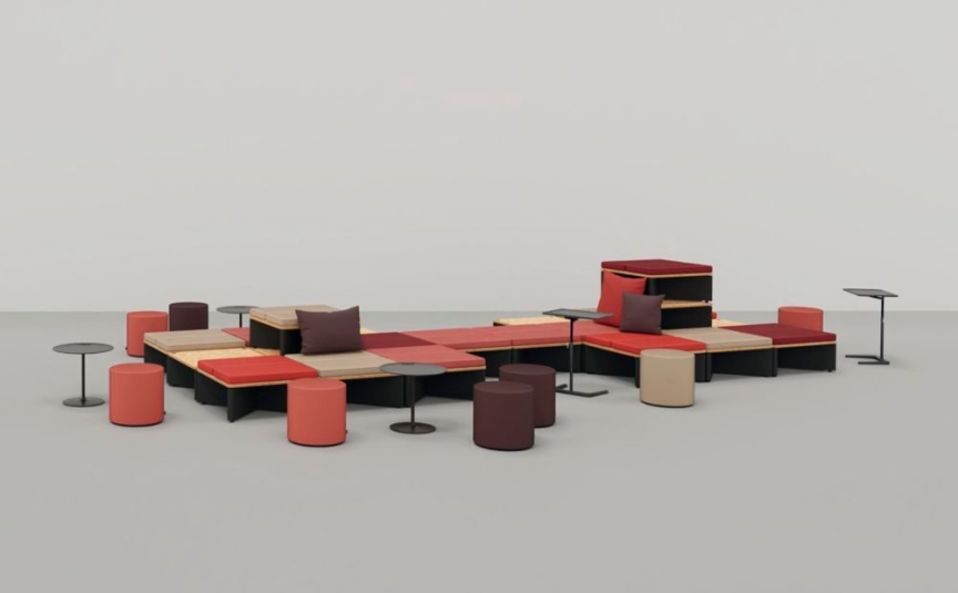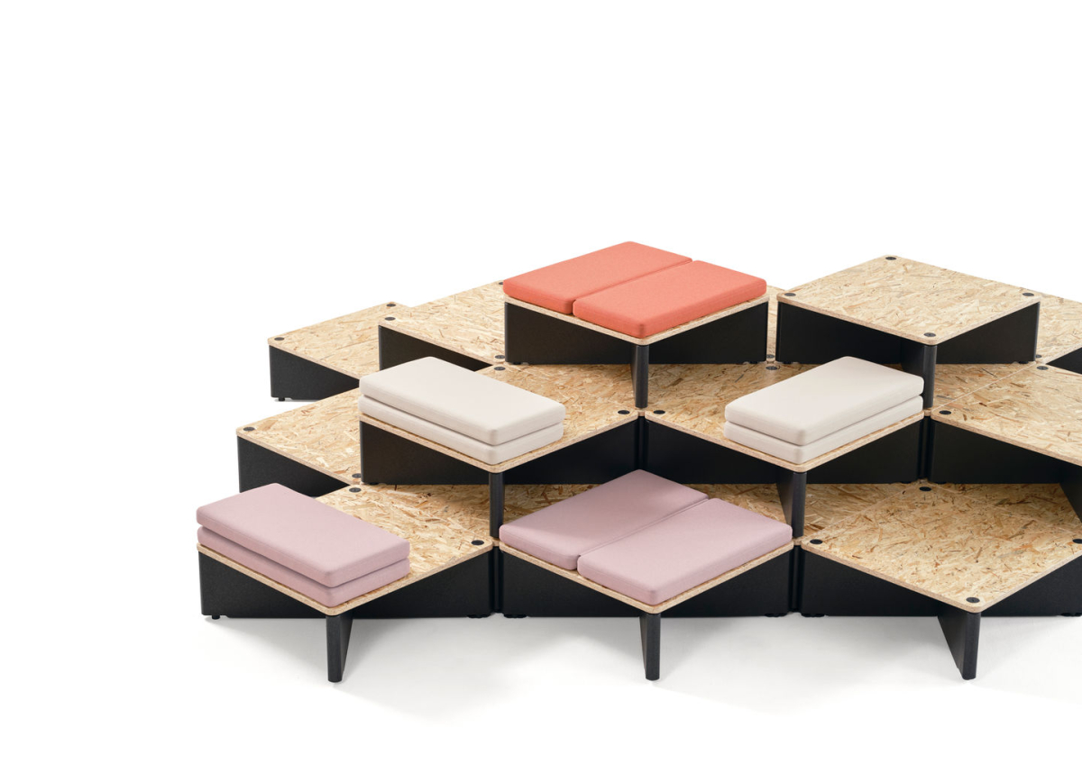 Thanks to the modular Reset system, designed by Stephan Hürlemann, stepped floor structures can be assembled, remodelled, dismantled, removed and reconstructed as easily as using building blocks. In-between zones, waiting areas and previously underutilised spaces can be used efficiently without the need for major planning or structural measures – such as for communication- friendly meeting landscapes, sofas for informal dialogue, islands for quiet work, arenas or forum-like platforms as well as display installations and much more.