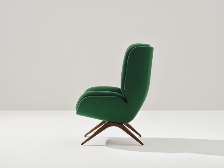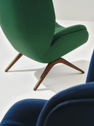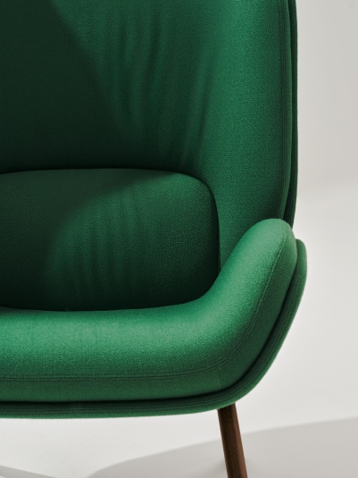Lepal balances comfort with ergonomics to functional and aesthetic effect. A sculptural profile and soft cushioned seat create a dynamic contrast with a soft interior space and high curved back, generating a beautiful expressive piece with a strong identity. Designed for any space, the elegant monochromatic look of Lepal has options for single or bi-material upholstery, and a metal or wood base. The collection is FSC®-certified (FSC-C148360) and its metal base is powder-coated. Detailed upholstery and internal components are put together without the use of glue, making the product fully disassemblable and ready for recovery and reuse prior to end of life recycling.