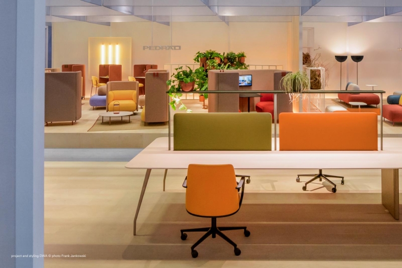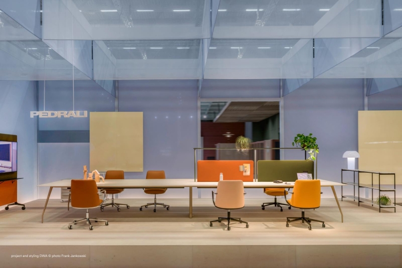 Rizz Workstation, zaprojektowany dla Pedrali przez Robina Rizziniego, to system stanowisk pracy dla dwóch, czterech lub ośmiu osób. Ten stół wyróżnia się konstrukcyjną wytrzymałością ukrytą pod czystymi liniami, która łączy nogi z aluminiową ramą nośną ukrytą pod blatem, zapewniając estetyczną lekkość i maksymalną stabilność. W przypadku dłuższych stołów konferencyjnych lub roboczych centralna prostokątna kolumna stalowa z zaokrąglonymi krawędziami zapewnia stabilność, służąc jednocześnie do zarządzania okablowaniem.