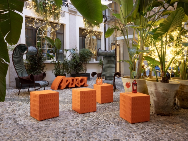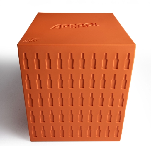 Wykonany w 100% z polietylenu nadającego się do recyklingu, Aperol Cubo ma po bokach stylizowane sylwetki butelek Aperol, a na górze dumnie prezentuje logo marki. Ten zabawny i praktyczny sześcian może służyć jako stolik pomocniczy, dodatkowe siedzisko lub rzeźbiarski akcent na tarasach, w ogrodach, salonach i przestrzeniach hotelowych.
