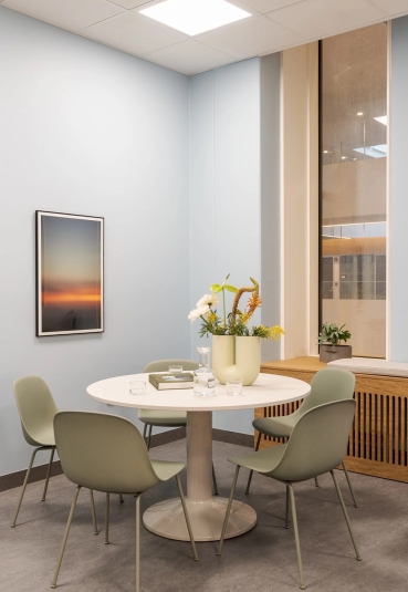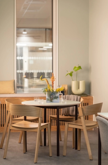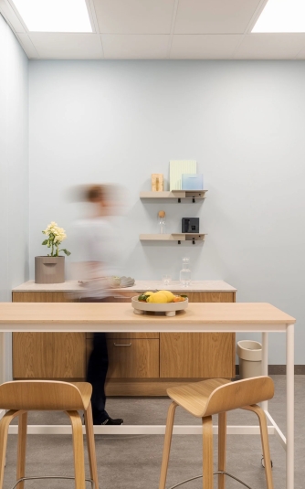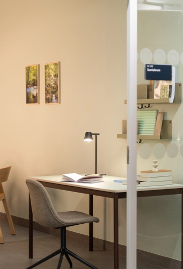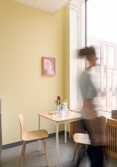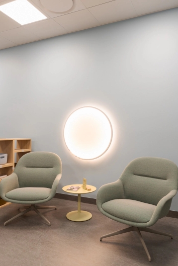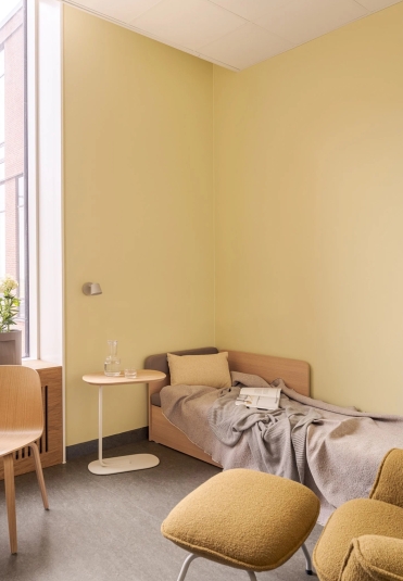 Wspólnie z przełożoną pielęgniarek Tiną Seidelin Rasmussen, Maj pomogła stworzyć projekt, który łączy doświadczenia życiowe i wiedzę kliniczną. Efektem jest seria przestrzeni zaprojektowanych z troską o osoby oczekujące, odpoczywające i przetwarzające informacje — gdzie przemyślany projekt dyskretnie wspiera chwile wytchnienia w niepewności.