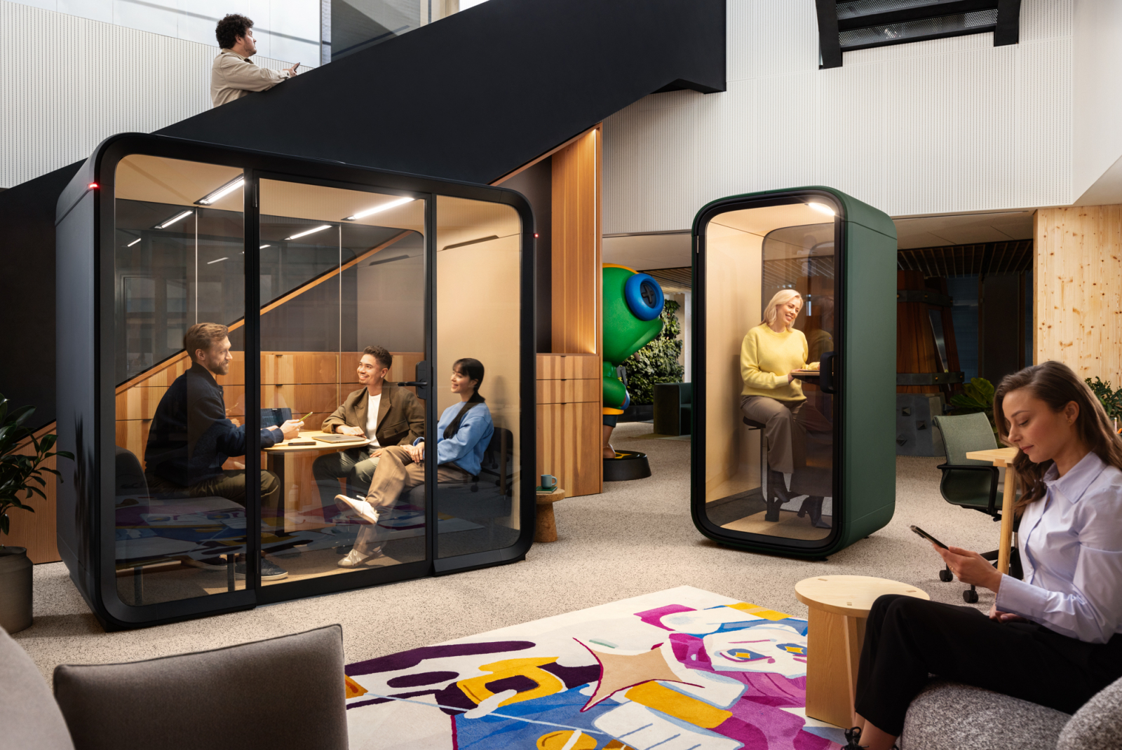 Biblioteczka Wave przyciąga wzrok przy wejściu do biura a dębowe taborety i stoliki kawowe Nomade są rozsiane w różnych pomieszczeniach tak aby zapewnić elastyczne opcje siedzenia.
